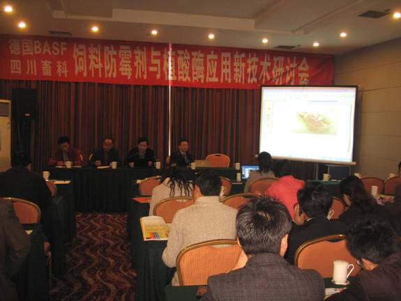 4月8日和9日,由德国巴斯夫公司、四川省畜科院动物营养研究所、四川省畜科公司联合举办的“2010年饲料防霉剂和植酸酶应用新技术研讨会”,分别在眉山东坡国际大酒店和成都望江宾馆成功召开。眉山市饲料办叶主任到会祝贺,眉山市畜牧局蔡局长光临并发表热情洋溢的讲话。会议围绕当前畜牧业和饲料工业存在的饲料资源短缺和动物饲料霉菌毒素污染的问题,就如何提高产品质量,有效降低企业生产成本,从而提升市场竞争力和增加产品附加值的问题进行了深入的探讨。